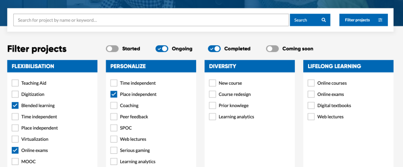 Bij de projecten kan je fiteren op vele kenmerken, filters die TU/e zelf onderhouden kan