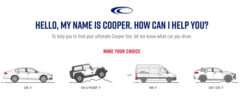Het hart van elke Cooper Tire en Avon Tyres website is de Car/Tire matcher, een uitgekiende zoekfunctie die je in een paar tellen bij de juiste banden brengt. In plaats van het aanvinken van talloze checkboxjes en pulldowns wordt je op een natuurlijke manier door het keuze proces geleid, ook op mobiel.