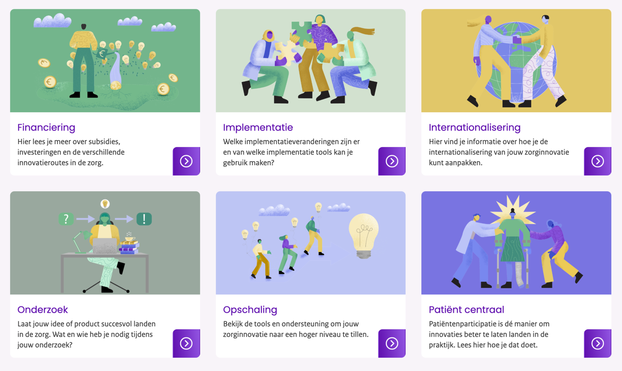 Met een update van de huisstijl werd het ook tijd een nieuwe website te ontwikkelen die de informatie voor zorginnovatoren optimaal ontsluit. Het concept en design van de website is (in nauwe samenwerking met het team van Zorg voor innoveren) ontwikkeld door WebHare bv.